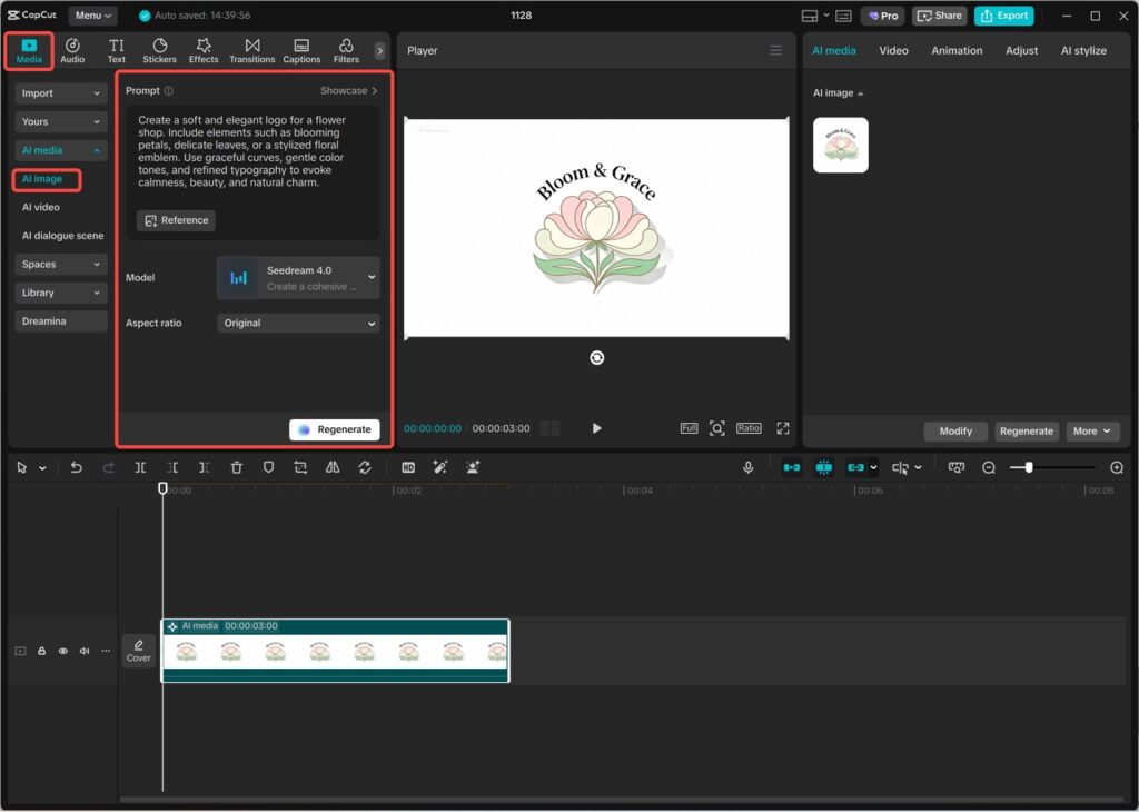 Go through CapCut Desktop and create a new project. Go to the section of AI media and choose an AI image. A thorough prompt, enter your fancied type of animated logo with your brand name, colours, shapes, and style of animation. It is also possible to drop your current logo and use it as a template to help the AI know who you are and create the animated one based on it.